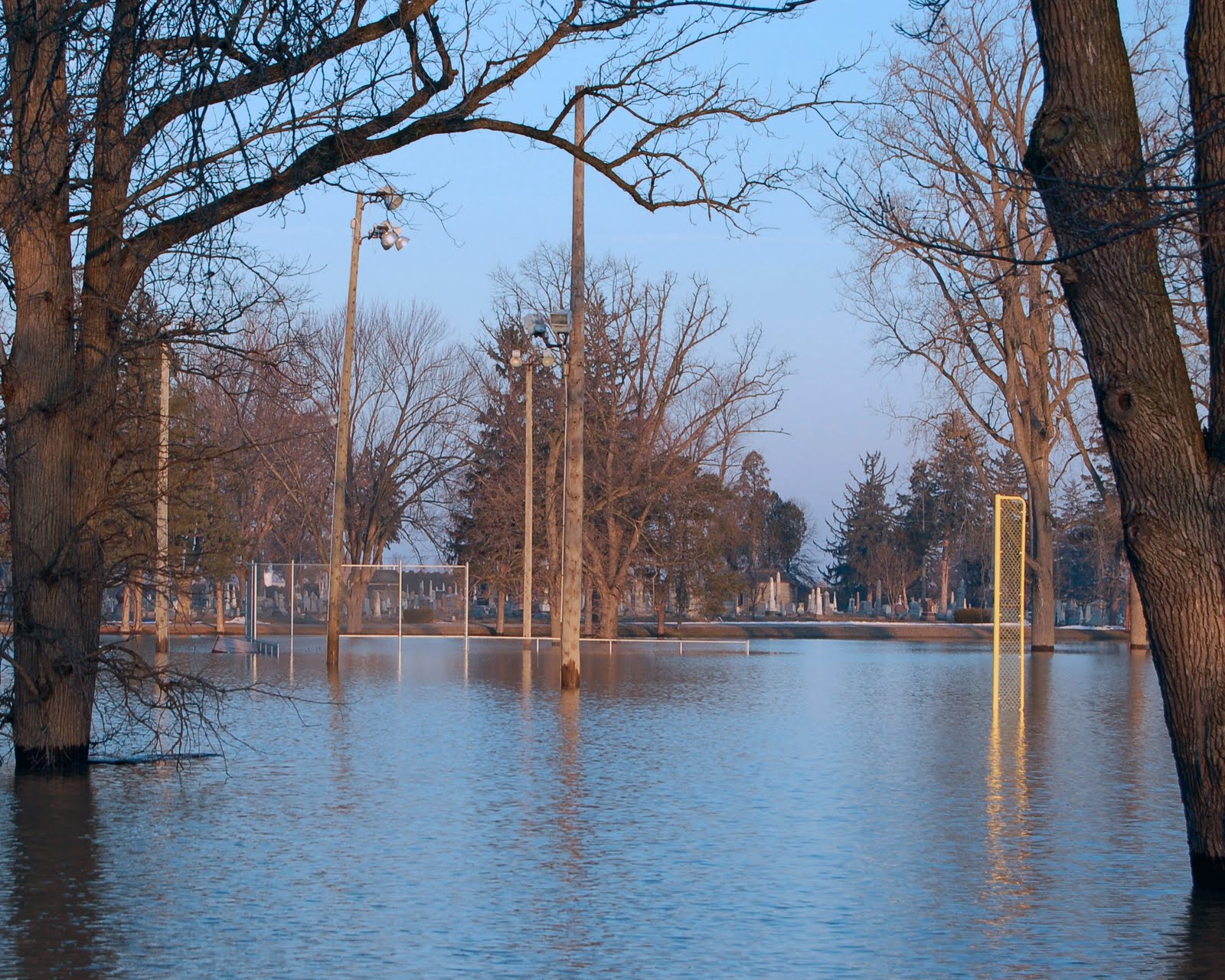 {that center fence in this photo is the catcher's backstop. you can just see the peak of the dugout floating on the left side of the photo, in front of the telephone pole. if you click on the photo to enlarge it you will just barely see the top of the bleachers rising out of the water.}